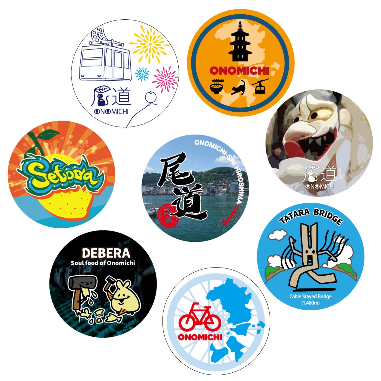 尾道のロープウェイや千光寺などの名所・観光地、デベラや八朔・レモンなどの特産品、ラーメン・尾道焼などのグルメ、ベッチャー祭や住吉花火まつり、林芙美子、多々羅大橋などをイラストで描いています。